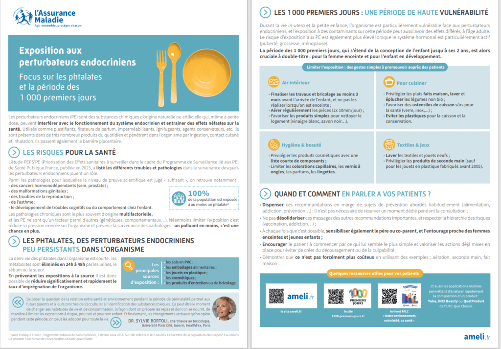 Des ressources complémentaires, telles que le mémo « Exposition aux perturbateurs endocriniens : focus sur les phtalates et la période des 1 000 premiers jours », sont également disponibles en téléchargement sur Ameli.fr pour faciliter cette sensibilisation : memo-exposition aux perturbateurs endocriniens.pdf